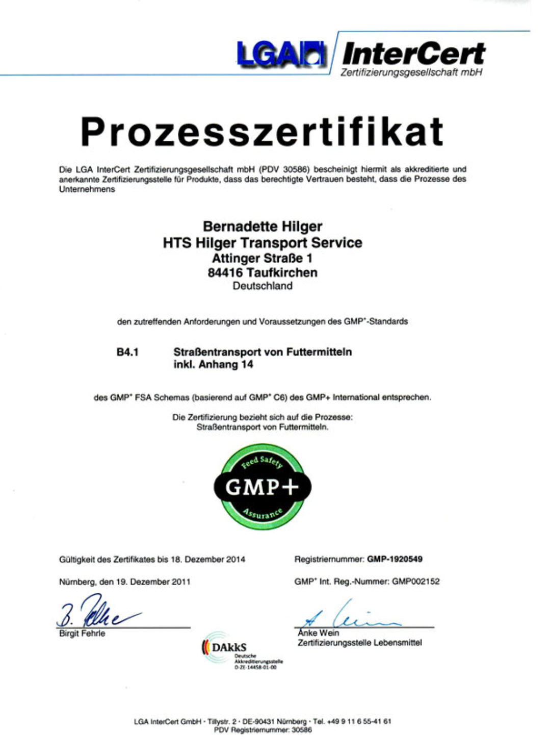 den Straßentransport von Futtermitteln zertifiziert.